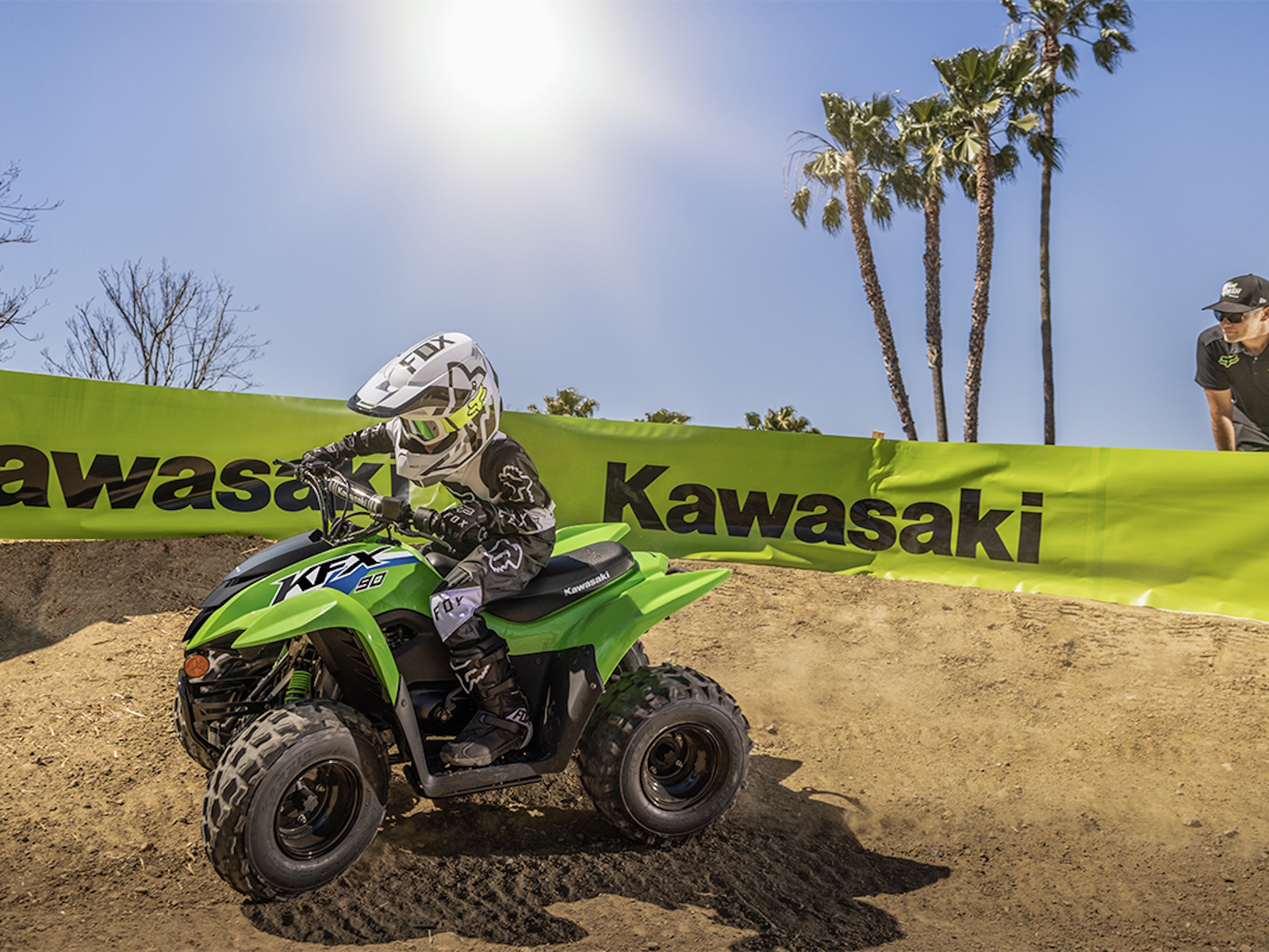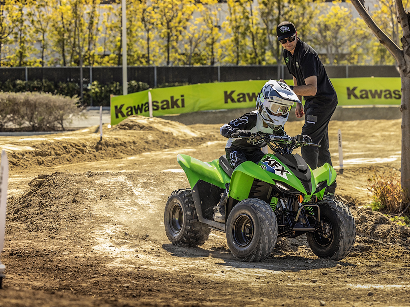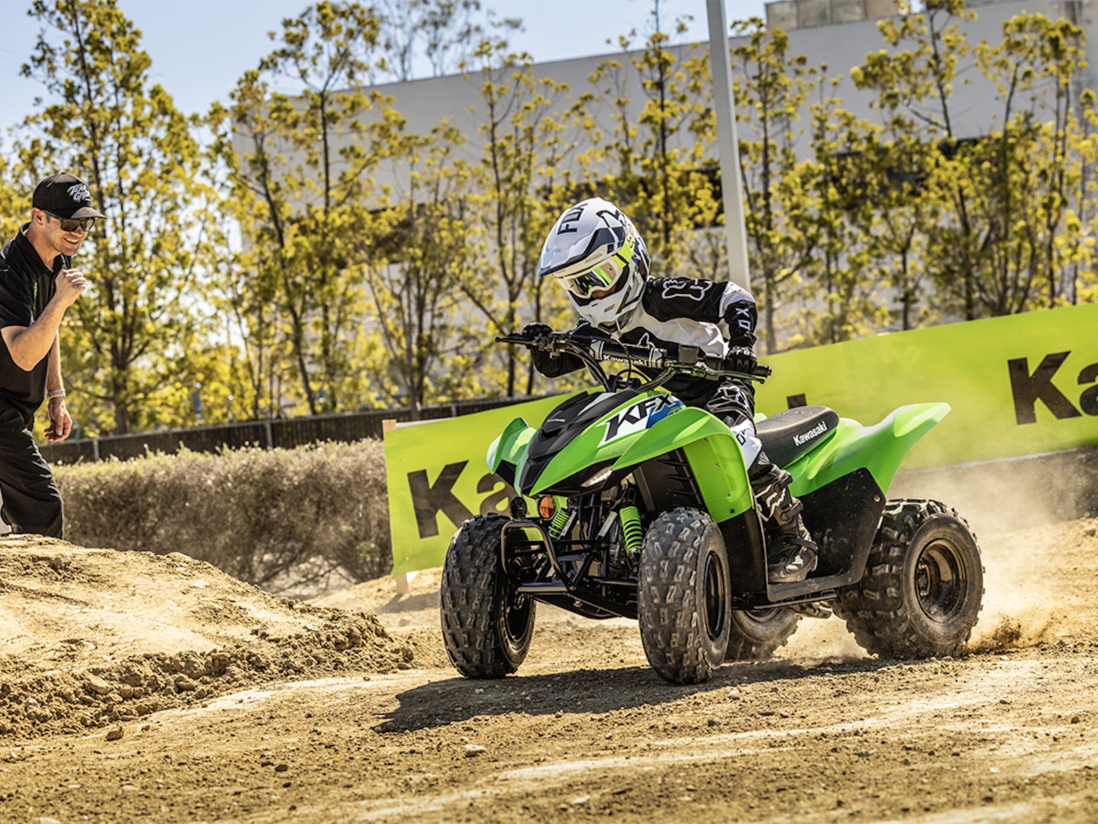 Four-wheel fun starts with KFX®. Get the kids outdoors and ready to ride on the KFX®90 ATV line with proportionate power and size for riders ages 10 and older. KFX90 ATVs let kids take on more challenging tracks and bigger adventures with an 89.9cc engine and sporty suspension.