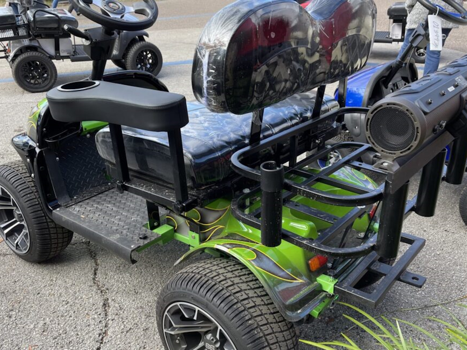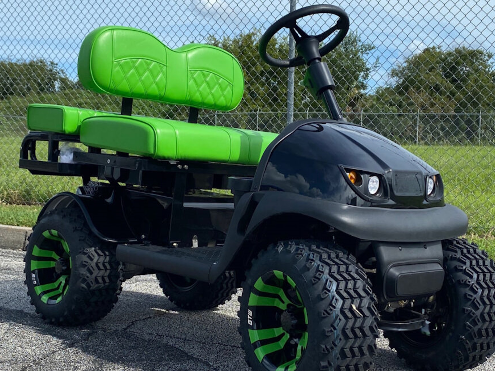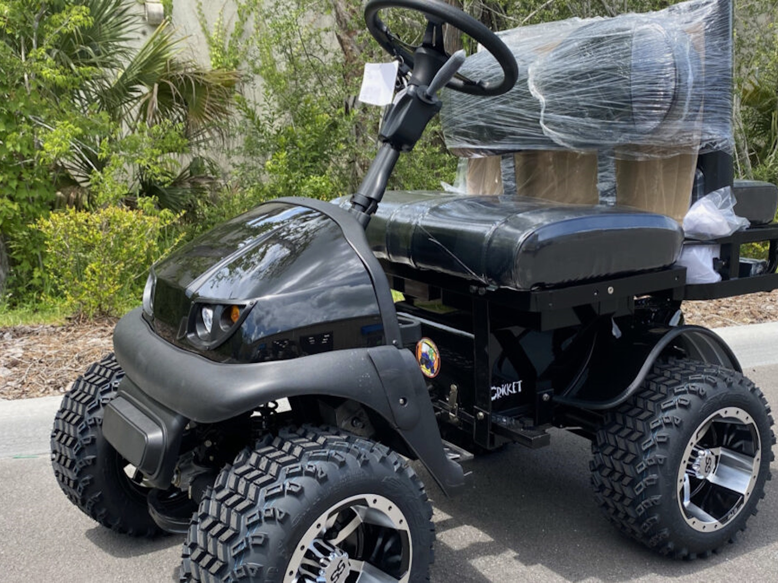 Want a faster and bigger RX5 Cricket mini golf cart. The Grasshopper™ is based off the Cricket RX5 platform. This model is great for offroad campgrounds, horse events, boat docks and exploring the outdoors on a rough terrain. Custom patented 4 bolt aluminum hubs, patented aluminum spacers, 10" wheels w/ 18" tires, patented motor modifications and upgraded electronics. You will NOT find this model at any other dealer. The larger footprint of the Grasshopper™ is increased in width, height and length and allows this Cricket to climb over more obstacles. The speed control is increased to gain about 14-17 mph depending on load and grade. Maximum Riding Grade Level 10%. The rear cargo rack can accommodate additional off road supplies; coolers, camp chairs, our 2 extra passengers. Not to be operated by drivers under 16 years of age. The Grasshopper model is still collapsible. The total height is now 35", Width is 38", Length is 74" (extended),60" (collapsed). The biggest gain is the overall height on the frame. The weight of the Grasshopper™ is 480lbs. Over 12" from frame to ground, floorboard is now 11" from the ground, motor is 6" from the ground. Starting at $7899 - Call us today! All CRICKETS have a standard EXCLUSIVE 5 YEAR BUMPER TO BUMPER WARRANTY when you buy your cricket cart from us in Daytona Beach, FL. We now offer a lithium battery edition of the Cricket Grasshopper model for longer travel and long term storage capabilities.