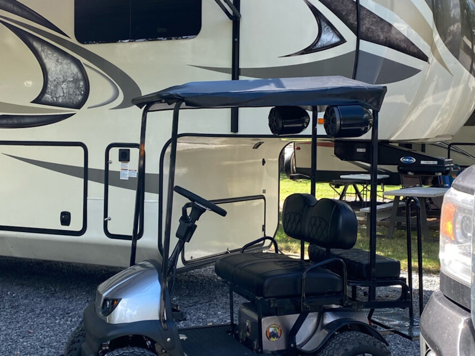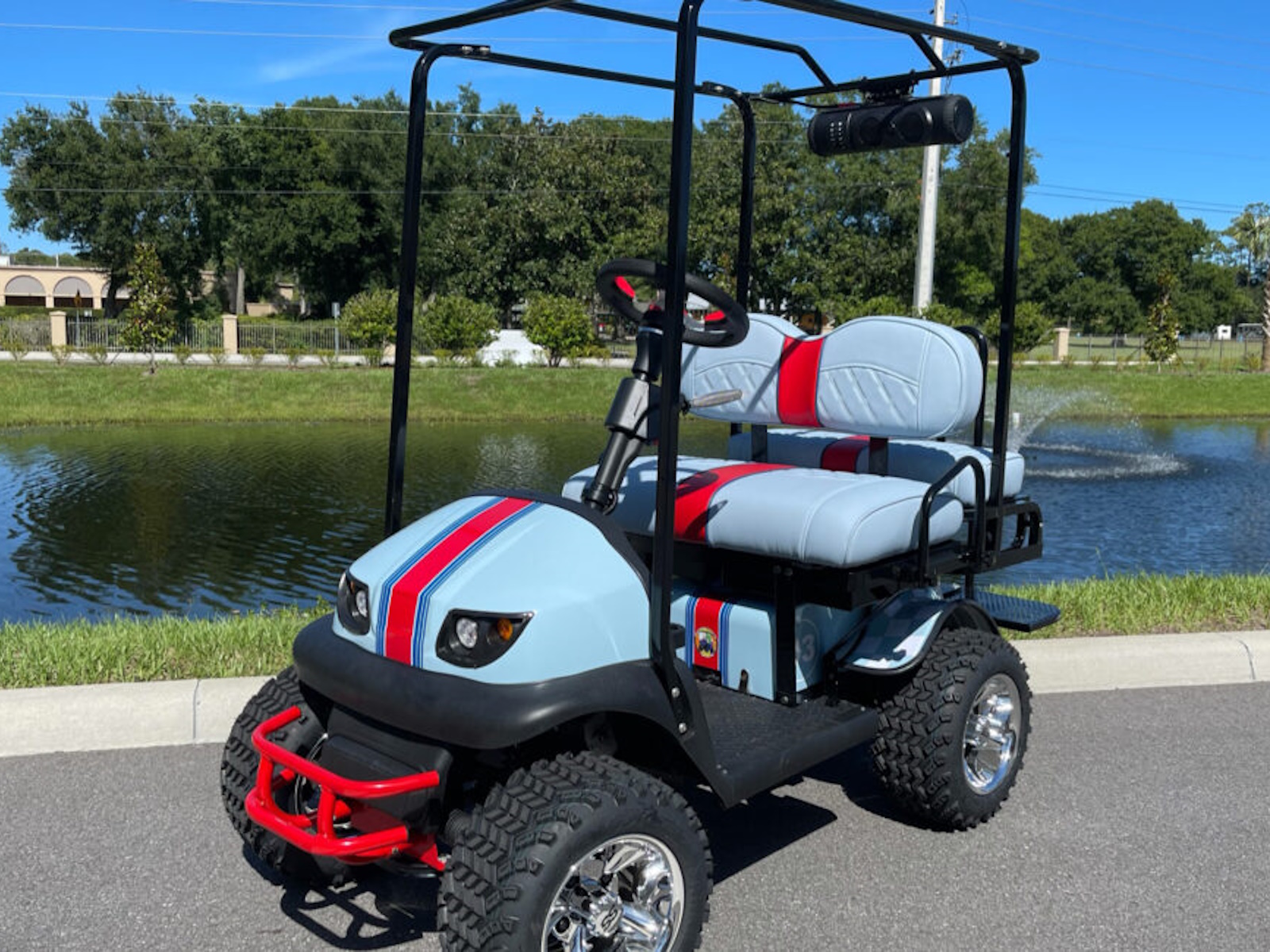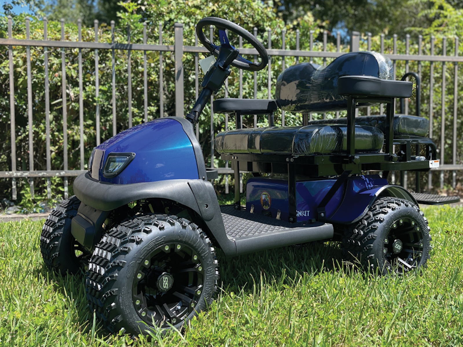 Want a faster and bigger RX5 Cricket mini golf cart. The Grasshopper™ is based off the Cricket RX5 platform. This model is great for offroad campgrounds, horse events, boat docks and exploring the outdoors on a rough terrain. Custom patented 4 bolt aluminum hubs, patented aluminum spacers, 10" wheels w/ 18" tires, patented motor modifications and upgraded electronics. You will NOT find this model at any other dealer. The larger footprint of the Grasshopper™ is increased in width, height and length and allows this Cricket to climb over more obstacles. The speed control is increased to gain about 14-17 mph depending on load and grade. Maximum Riding Grade Level 10%. The rear cargo rack can accommodate additional off road supplies; coolers, camp chairs, our 2 extra passengers. Not to be operated by drivers under 16 years of age. The Grasshopper model is still collapsible. The total height is now 35", Width is 38", Length is 74" (extended),60" (collapsed). The biggest gain is the overall height on the frame. The weight of the Grasshopper™ is 480lbs. Over 12" from frame to ground, floorboard is now 11" from the ground, motor is 6" from the ground. Starting at $7899 - Call us today! All CRICKETS have a standard EXCLUSIVE 5 YEAR BUMPER TO BUMPER WARRANTY when you buy your cricket cart from us in Daytona Beach, FL. We now offer a lithium battery edition of the Cricket Grasshopper model for longer travel and long term storage capabilities.