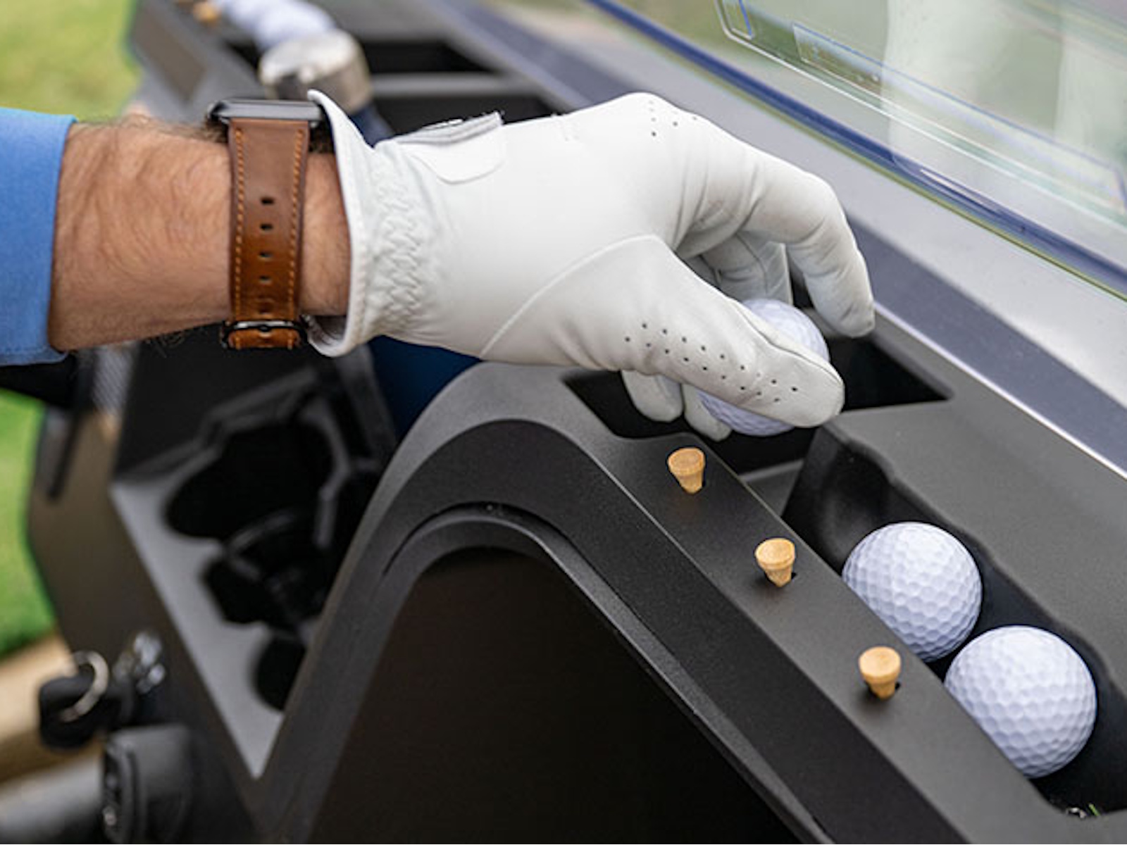 - The dash contains ample space for golf tools and personal items with dedicated storage for balls, tees, markers and cups.