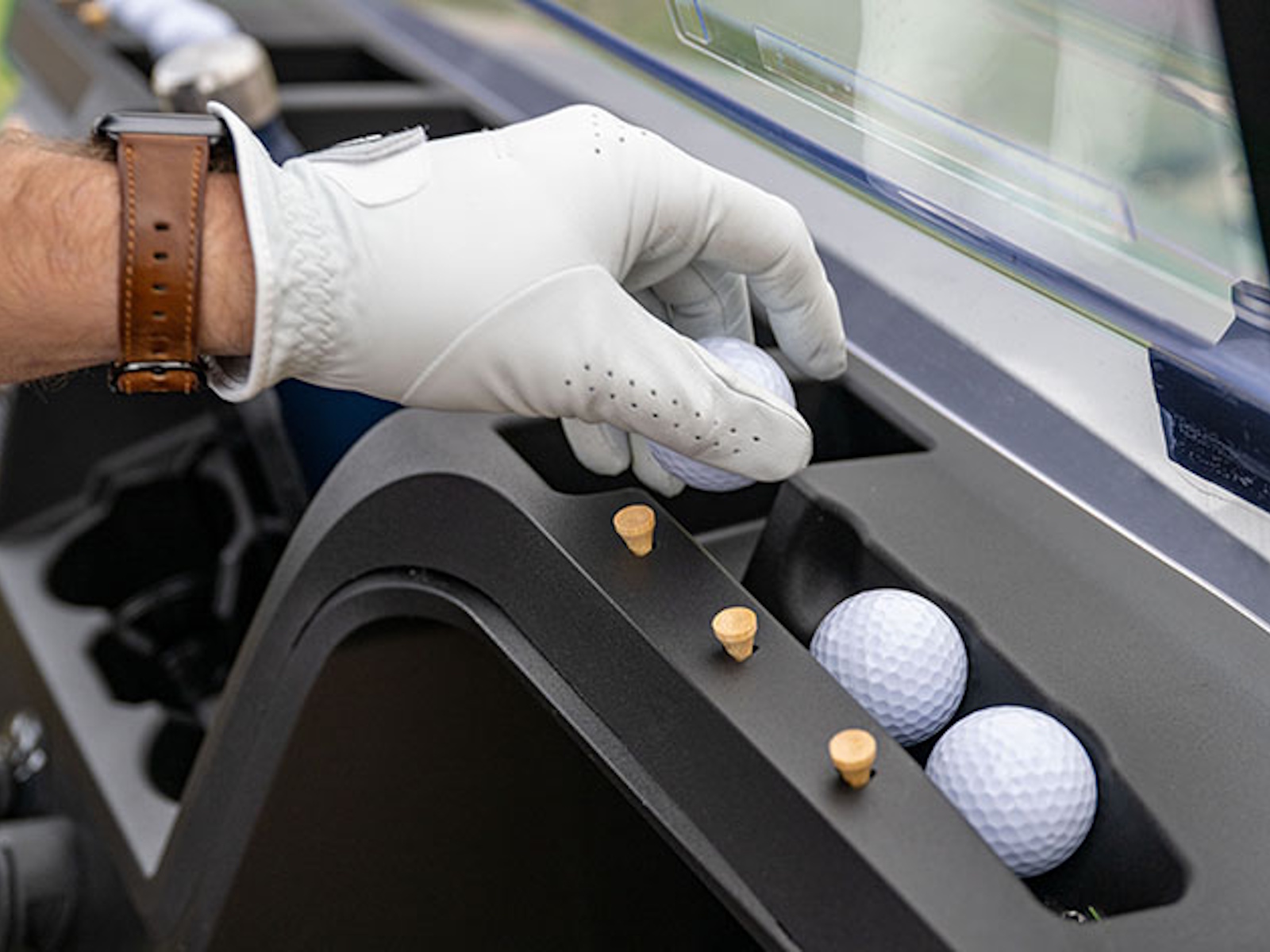- The dash contains ample space for golf tools and personal items with dedicated storage for balls, tees, markers and cups.