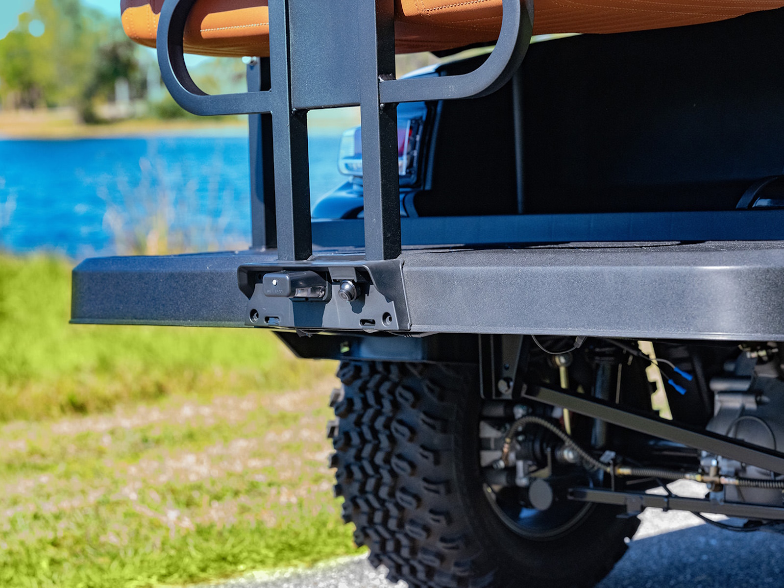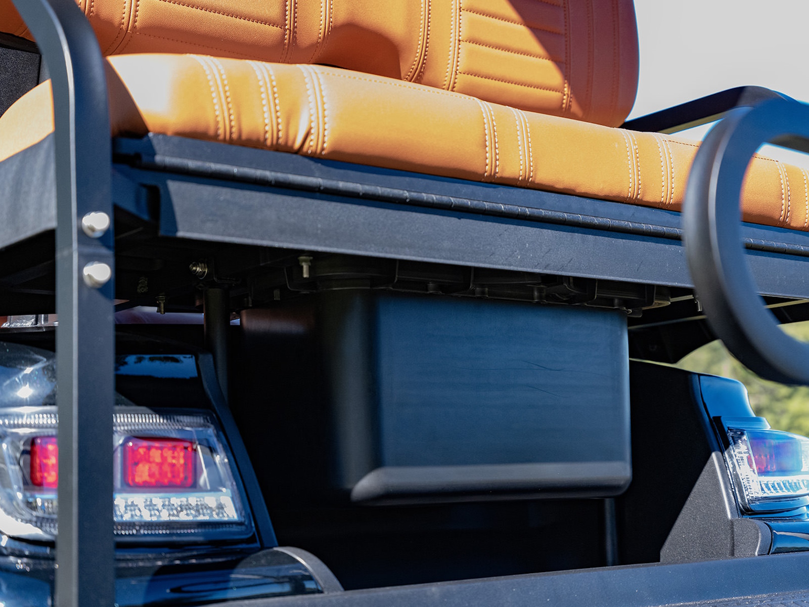 Thick Plush Seats with Custom Stitched Paneling, Marine Grade Vinyl, Solid Black or Brown, Color Matched with Black Accents. Foldable Rear Seat Perfect for Hauling. Built in Cooler Beneath Rear Seat.