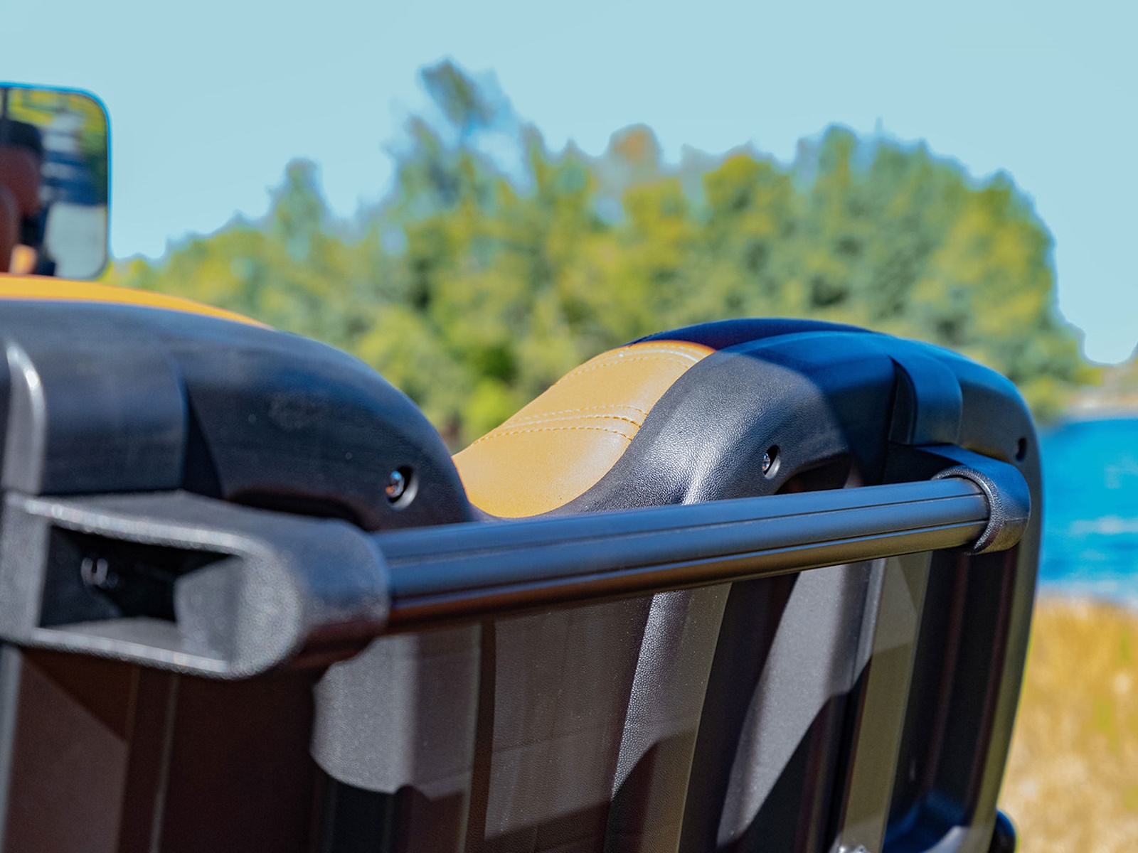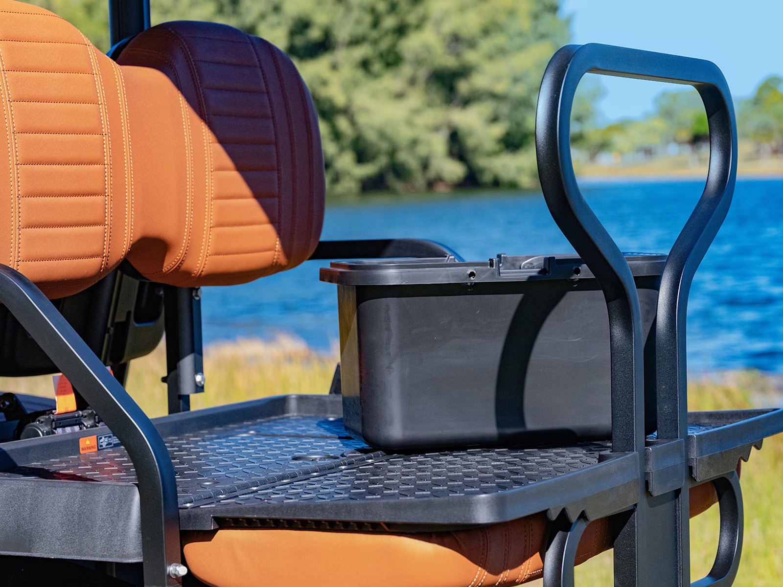 Thick Plush Seats with Custom Stitched Paneling, Marine Grade Vinyl, Solid Black or Brown, Color Matched with Black Accents. Foldable Rear Seat Perfect for Hauling. Built in Cooler Beneath Rear Seat.