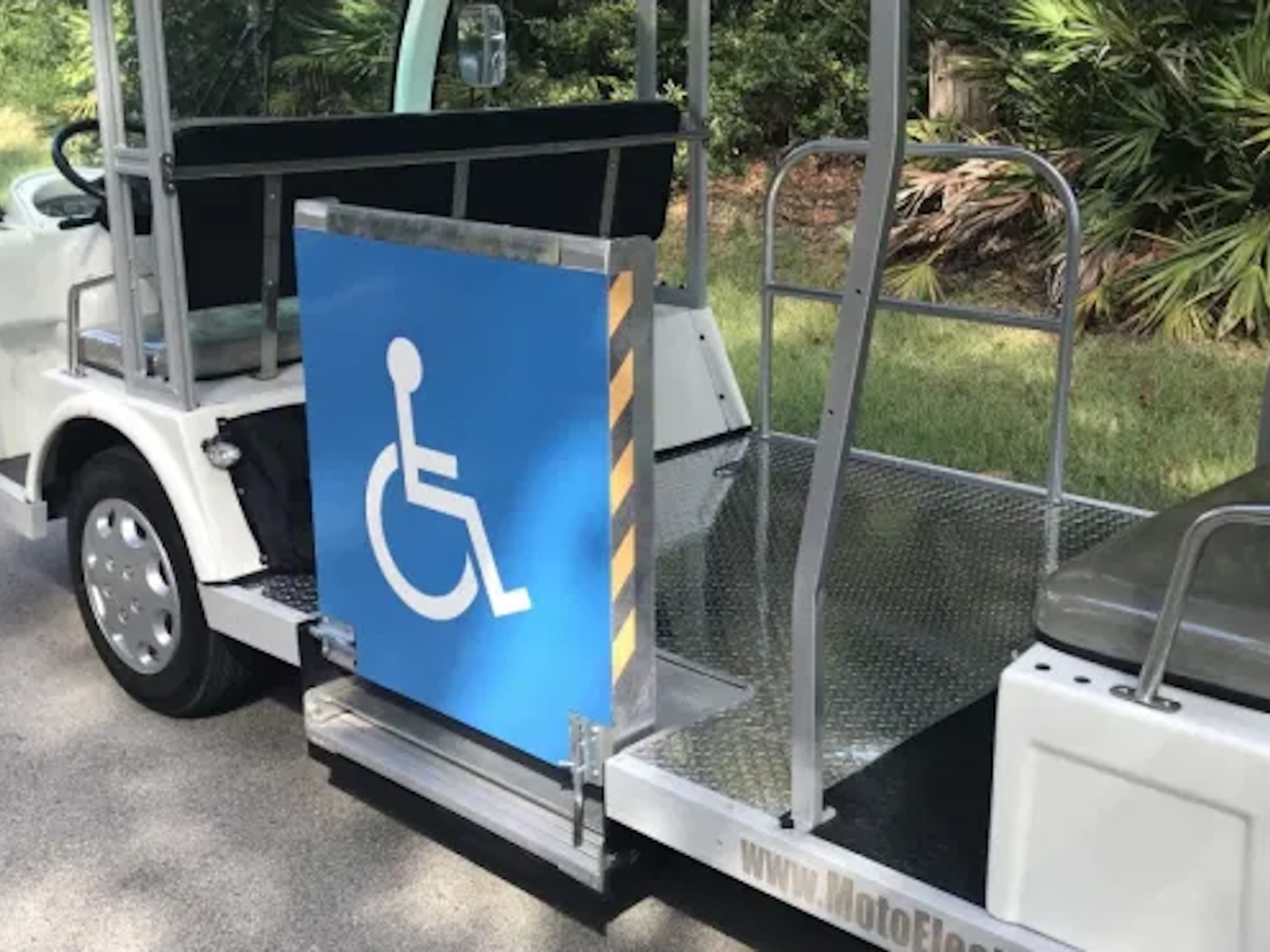 The MotoEV Transit Buddy 15 Passenger ADA Bus is ideal for shuttle chores required around your Campus, Parking Lot, Town Center, Resort, or Facility. Some of these models may hold up to 28 passengers when our tag along trailer is purchased! With this option, a second bank of batteries can be installed within the trailer to increase travel distances greatly! On your MotoEV Transit Buddy, we can add many options such as back up cameras, DVD Players, heaters, fans and even air conditioning when necessary! Smaller shuttles have a 48-volt system as a power source with a single battery charger. Our larger shuttles (12-28 Passenger Shuttles) contain two 48 volt systems for the longer range and quicker charging than a 72 volt “series” battery system. This 15 passenger ADA shuttle bus comes standard with two chargers not one and each charger is responsible to charge only one bank of 48 volts of batteries. This decreases necessary charging time by half versus having one charger responsible for charging all batteries. Several models will qualify for the Low Speed Vehicle standards necessary to drive them on public roadways as well. Please consult a Moto Electric Salesperson for more specific details on this requirement.