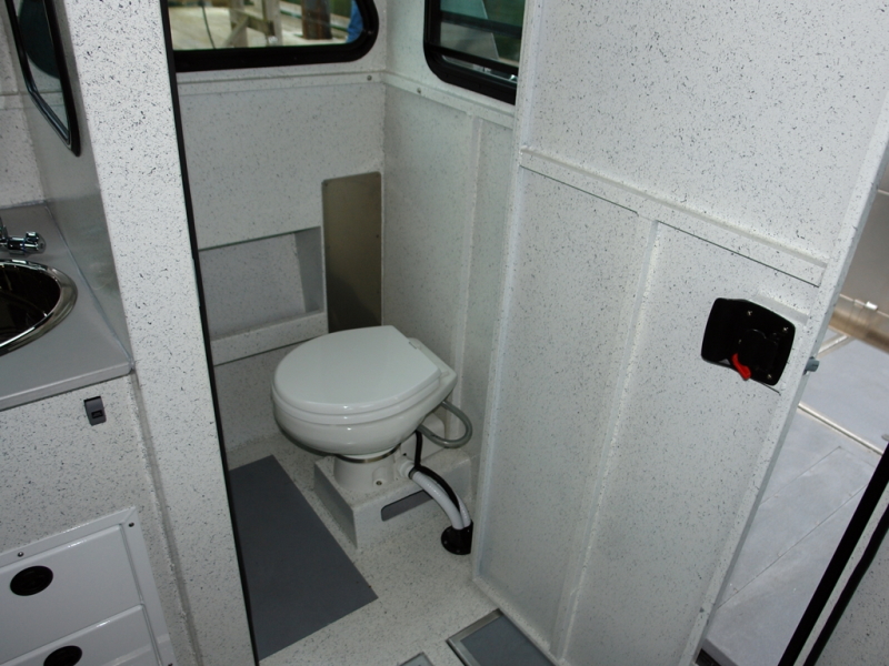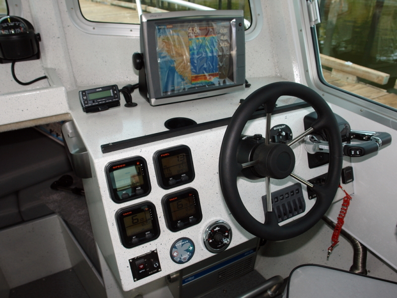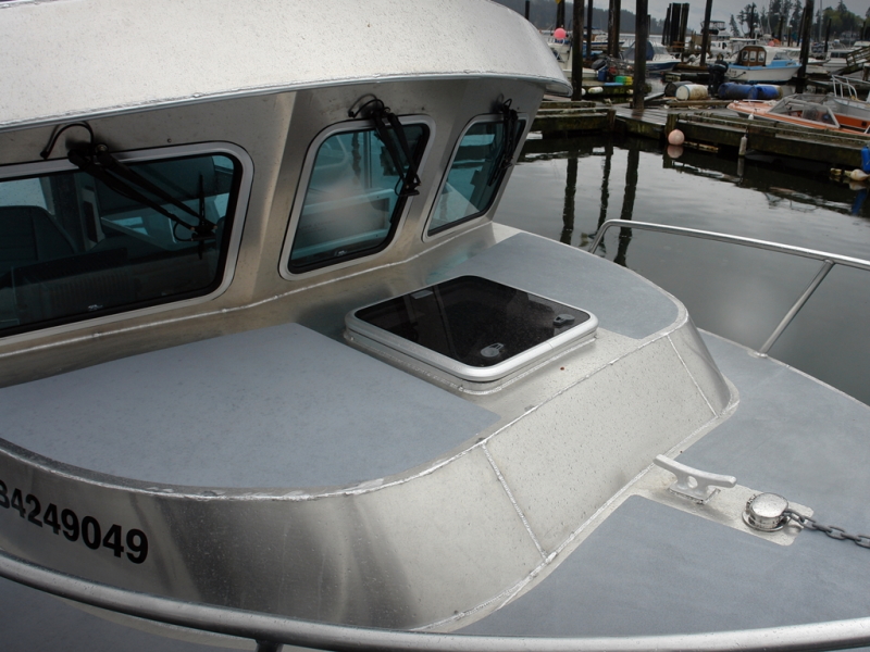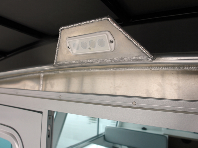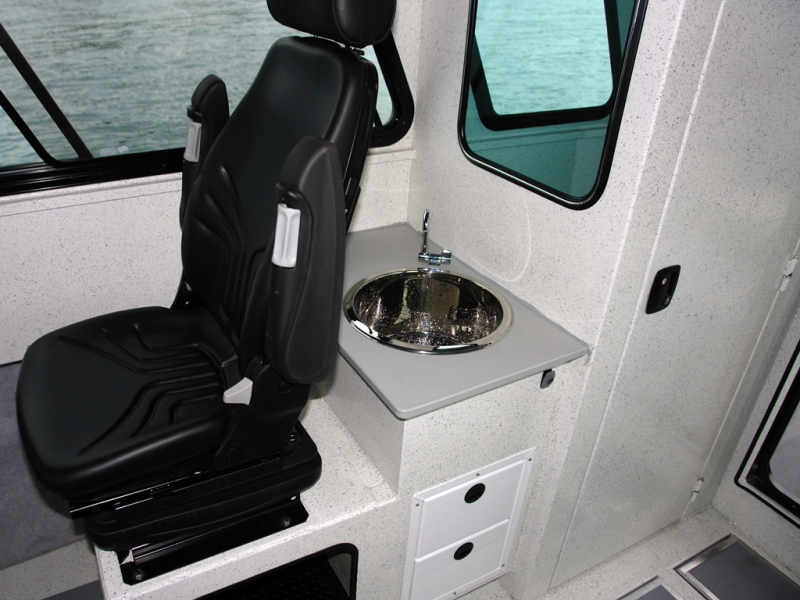 - 1 x Fully welded stand-up cabin including solid bulkhead with (1) hinged door, 3-piece forward leaning aluminum-framed windshield, (2) sliding side windows with flyscreens, (3) fixed rubber-framed bulkhead windows & (2) cuddy windows